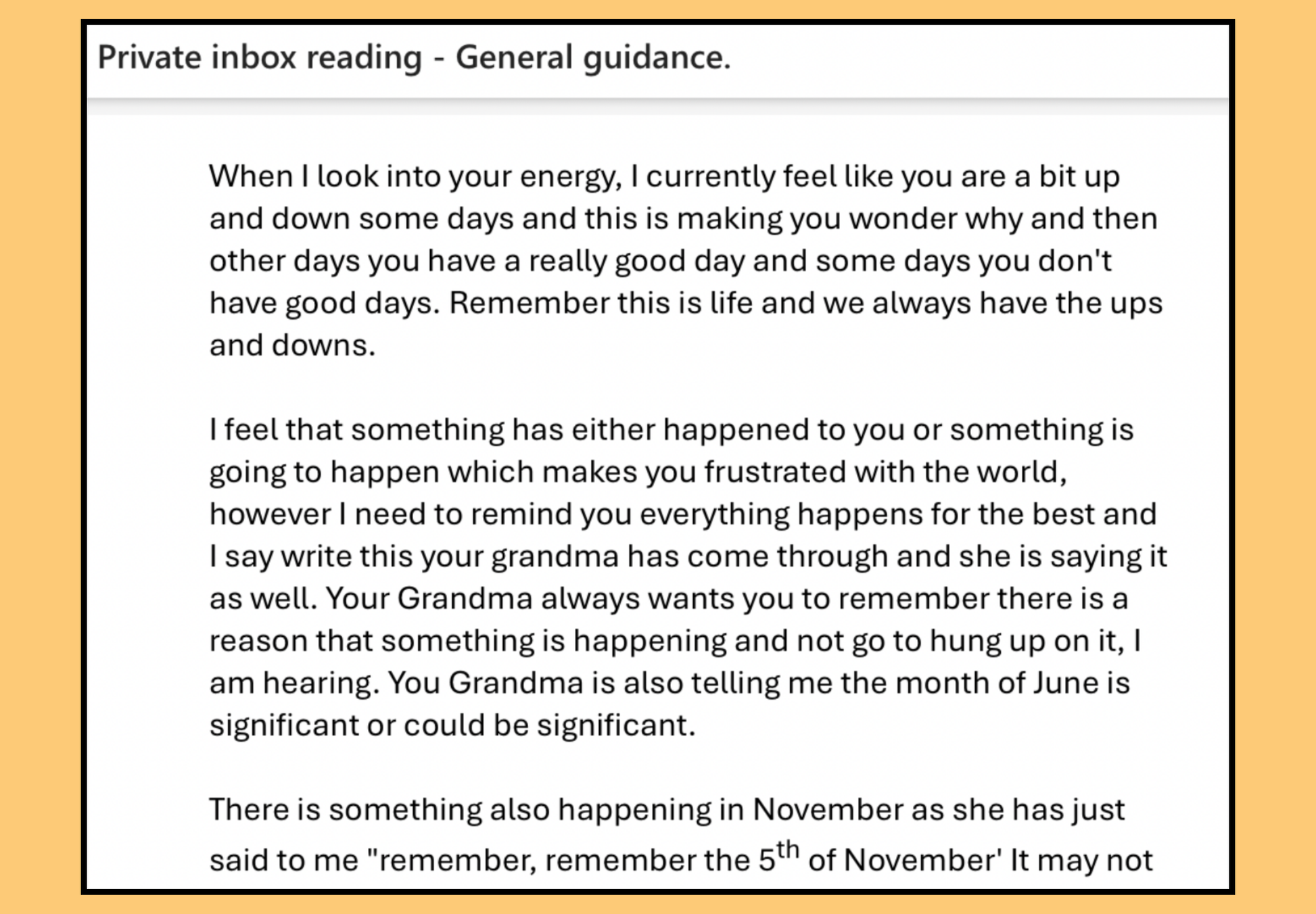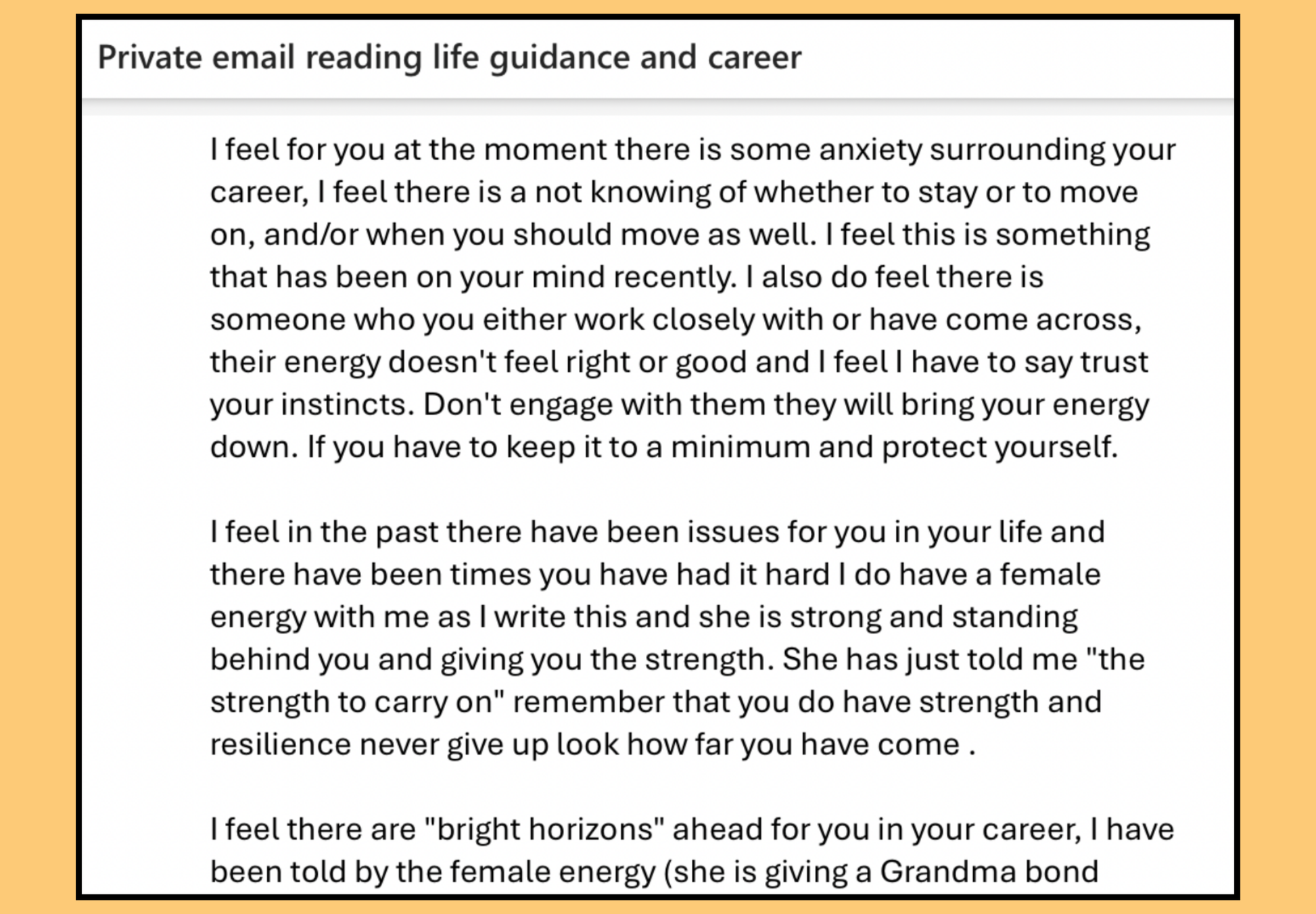 This private email reading written by myself provides guidance based on different parts in your life from love, guidance, career, or general guidance which will be straight to your inbox.
